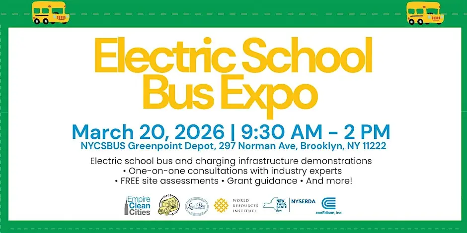 Empire Clean Cities, ConEd, NYCSBUS, Logan Bus, WRI, and NYSERDA invite you to an Electric School Bus Expo at the NYCSBUS Brooklyn depot. The ESB EXPO will feature interactive, real-world