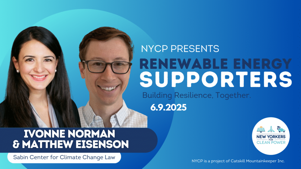 This is a recording from NYCP’s June Renewables Supporters Speaker Series on Monday, June 9, from noon to 1:00 P.M. It is a discussion on Legal Strategies for Overcoming Local Opposition to Renewable Energy Facilities with attorneys Matthew Eisenson and Ivonne Norman. Matt and Ivonne run a program called the Renewable Energy Legal Defense Initiative (RELDI) at the Sabin Center for Climate Change Law at Columbia Law School.
