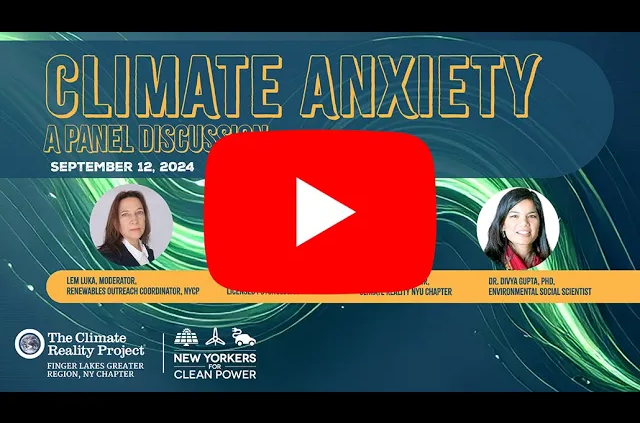 On Thursday, September 12, 2024, the NYS Chapters Coalition hosted an engaging panel discussion on the growing issue of climate anxiety and how it affects people across different age groups and professions. The event featured expert insights from Dr. Jennifer Fendya (licensed psychologist), Dr. Divya Gupta (environmental social scientist), and Lauren Kim (NYU student and climate activist).
